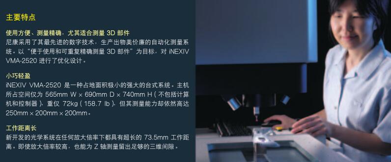 新款iNEXIVVMA-2520专为测量三维工件而设计。尽管本仪器小巧轻盈,仍然具有长达200mm的Z轴行程和73.5mm的工作距离,能十分方便地对机械部件、注塑模件、金属冲压件、电子设备、模具和医疗设备进行Z轴测量。标准的10倍变焦光学系统符合“高放大倍率时具有极高的分辨率,低放大倍率时具有广阔的视场”这一严苛的行业要求。低失真光学系统和高光强白色LED照明光源增强了对比度,提高了仪器的测量效率。即便对于带有多种颜色的部件,这样的设计组合仍能确保实现可重复测量。